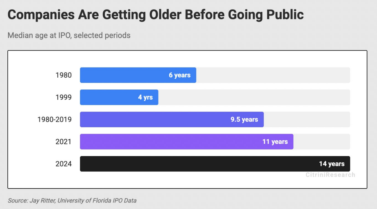 如今,类似苹果在 70 年代、AOL 在 90 年代初那个阶段就上市的公司,几乎没有了。