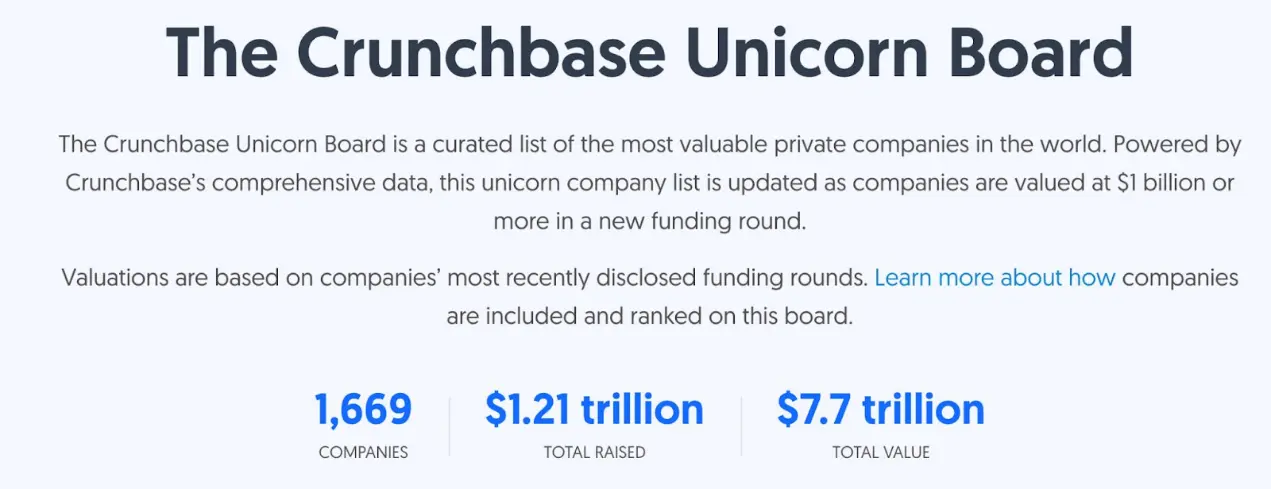 Crunchbase 独角兽榜单上的企业总价值达 7.7 万亿美元,超过了标准普尔 500 指数市值的 10%。