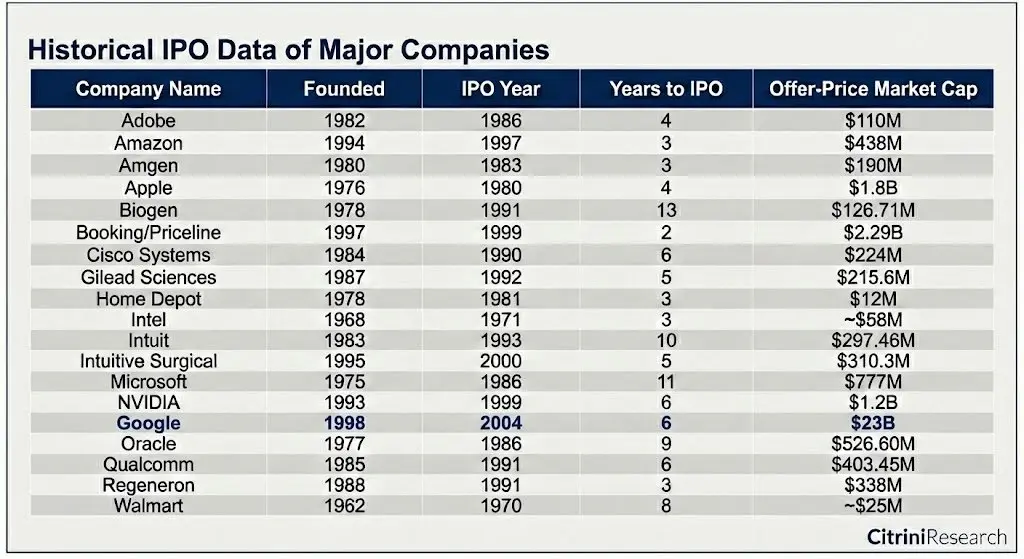 即使是市值最高的 IPO 公司--谷歌(230 亿美元),也只是当时前 100 大公司中的垫底水平。