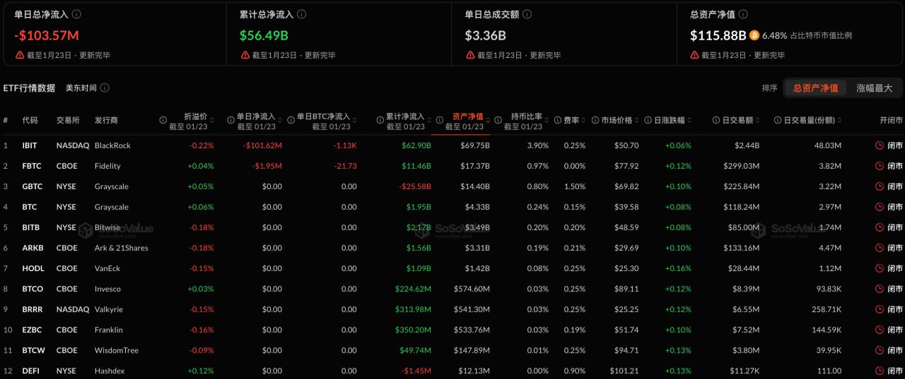 1月24日消息,根据 SoSoValue 数据,昨日(美东时间 1 月 23 日)比特币现货 ETF 总净流出 1.04 亿美元。