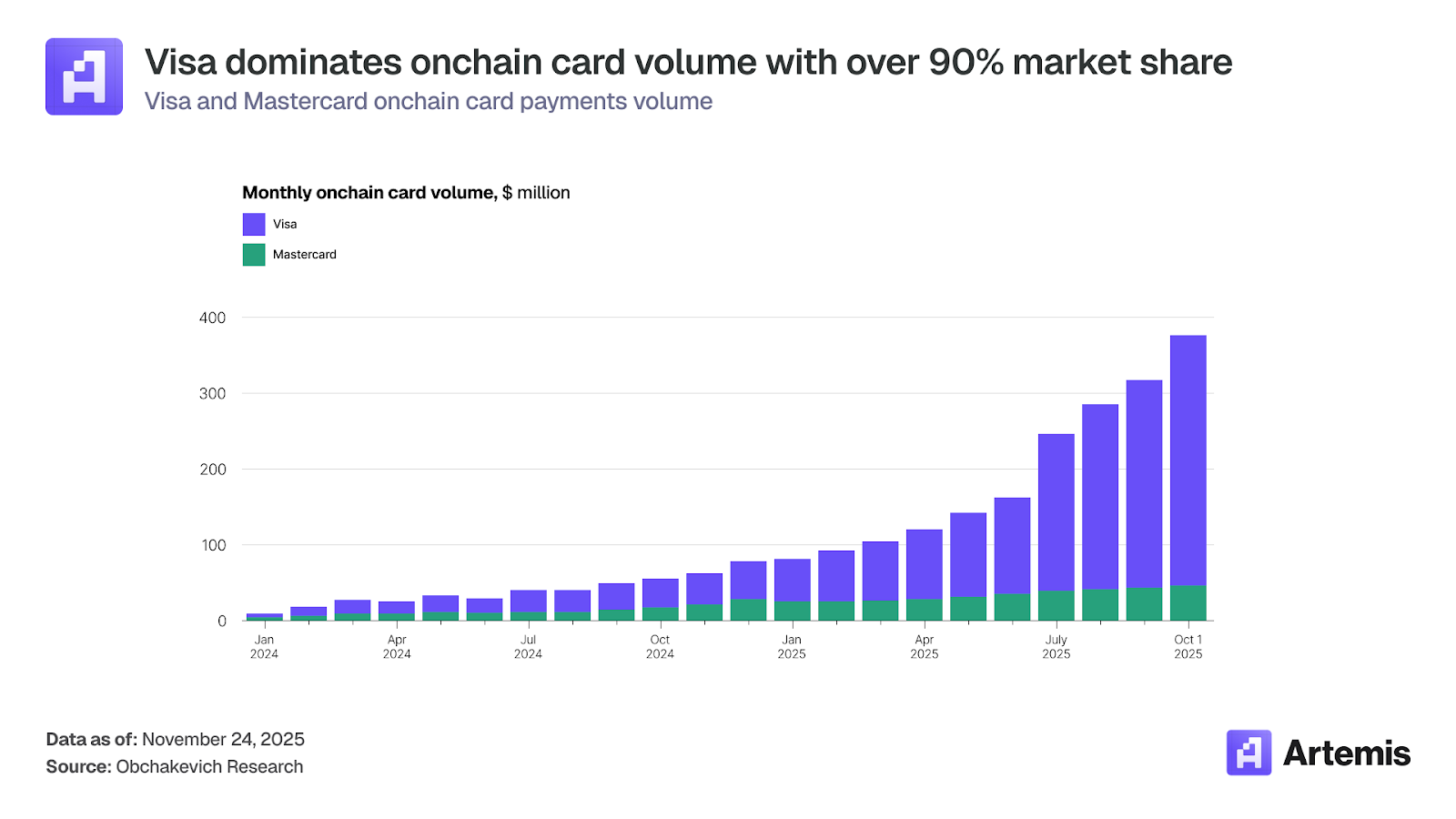尽管双方的支付项目数量相近,但 V,isa 在链上交易量中所占份额却远超对手。这种差异反映了双方不同的市场策略。