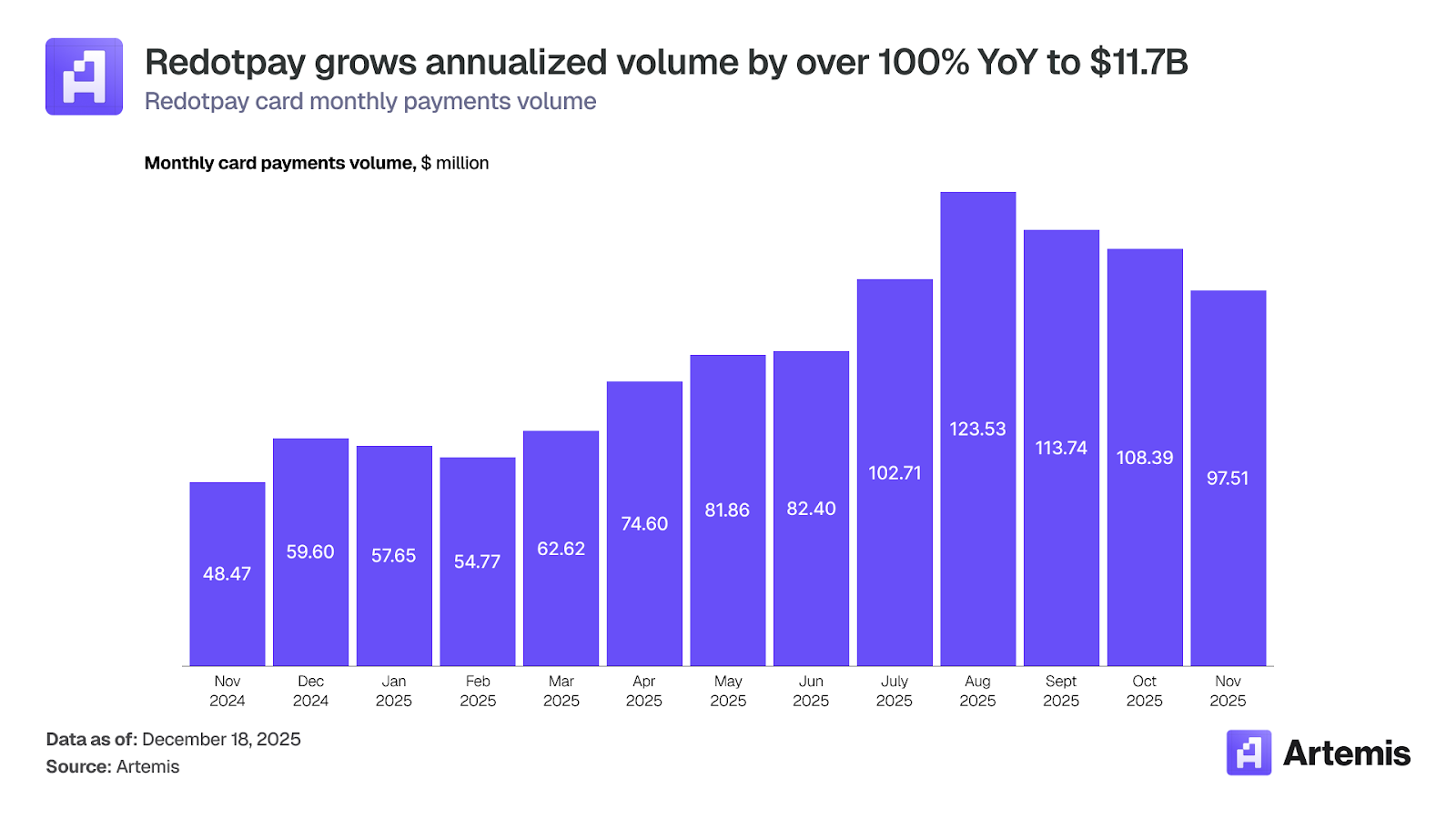 自 2023 年 1 月以来,加密卡交易量以每年 106%的速度复合增长,年化交易量达 180 亿美元,而同期 P2P 稳定币转账仅增长 5%,年化交易量为 190 亿美元。加密卡交易量已从零售交易量的一小部分增长到与 P2P 交易量相当。