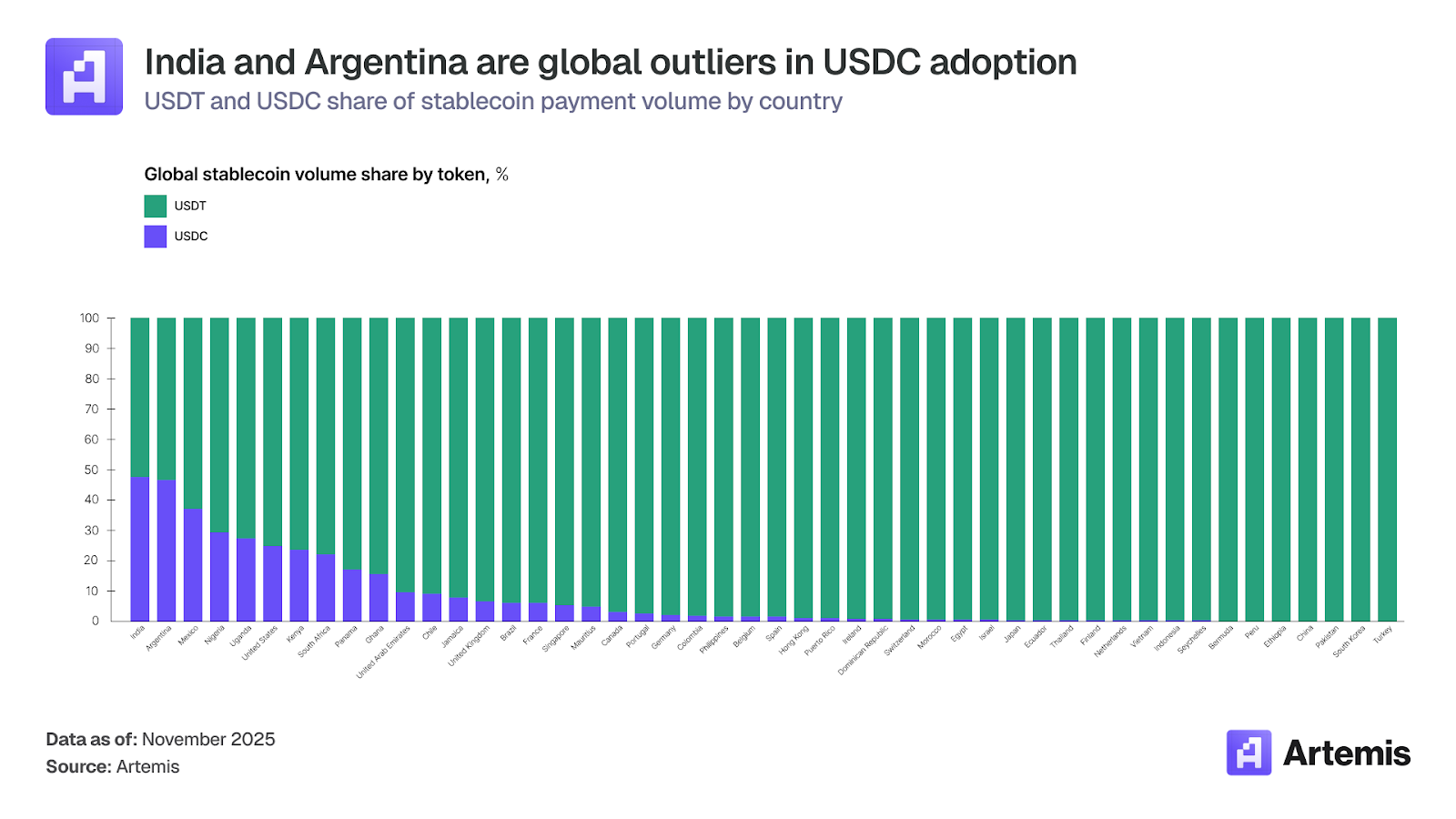 在几乎所有市场中,USDT 在稳定币交易量中占据主导地位。然而,有两个国家明显是全球的例外:印度(47.4% 的 USDC)和阿根廷(46.6% 的 USDC),这两个国家的 USDC 使用量几乎与 USDT 持平。这两个国家都蕴藏着巨大的加密卡市场潜力,但其本质却截然不同。