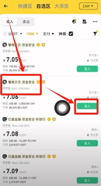 我们要找成单量和成单率多的商家来进行购买。比如“蟹商贝贝-资金安全”这一家,他有一个9431的成单量,同时他的好评率是100%,我们就可以跟它来进行购买,点击他后面的【买入】。
