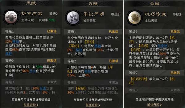 典韦的天赋【折冲左右】可以让典韦和典韦追击格上的单位获得12%的格挡率,主动发动时,能对2个随机单位造成伤害,并施加挑衅。受到直接伤害时,有50%概率进行反击,这是这套阵容的反击核心。