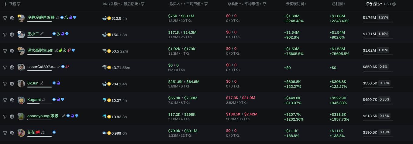 根据 GMGN 数据,冷静共买入 7.5 万美元,持仓 1.23%,目前浮盈超 165 万美元,未有卖出;王小二共买入 17.1 万美元,持仓 1.19%,目前浮盈超 154 万美元,未有卖出;深大高材生共买入 1920 美元,持仓 1.13%,目前浮盈超 153 万美元,未有卖出;0 xSun 共买入 25.16 万美元,持仓 0.39%,目前浮盈超 30 万美元,未有卖出。