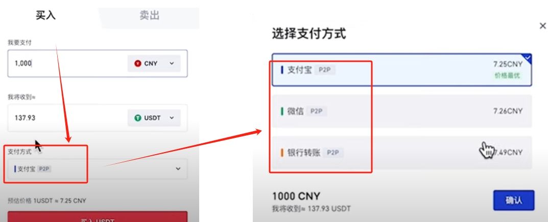 这边显示支持300多种支付方式,将近100种法币。其中包括Visa银联,比如说我们中国大陆用户,目前要购买对应的USDT,比如要购买1000人民币的USDT,就可以在右侧找到“CNY”,就是人民币。输入要购买的金额,下方会自动给我们算出来,支付1000人民币将收到137.93颗USDT。只要你上方输入要购买的金额,下方就会自动为你算出来你要购买的数量。
