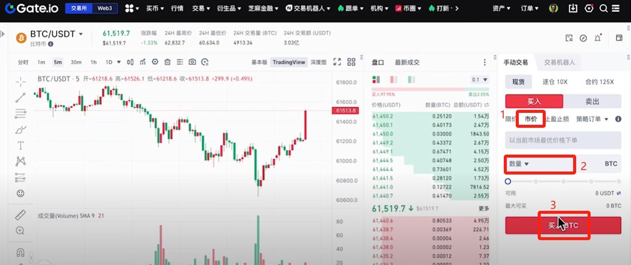 “限价”就是我们自己可以设置一个价格,比如我输入60000,也就是当比特币的价格跌到60000的时候,我们这笔订单才成交。期间只是挂单,不会产生交易,不会产生手续费。今天的价格目前是61519,交易额这里我可以手动输入,你要购买的金额,点击【买入BTC】就可以了。当比特币的价格跌到60000的时候,我们这笔单就成交了。