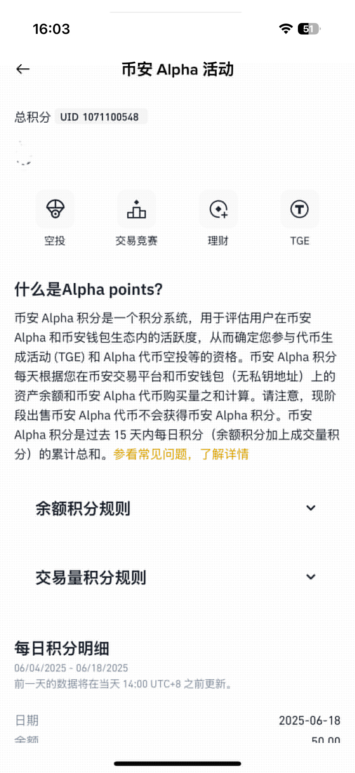 在Alpha专区中,用户活跃度将转化为Alpha Points积分,这些积分是参与TGE和新币空投的资格凭证。