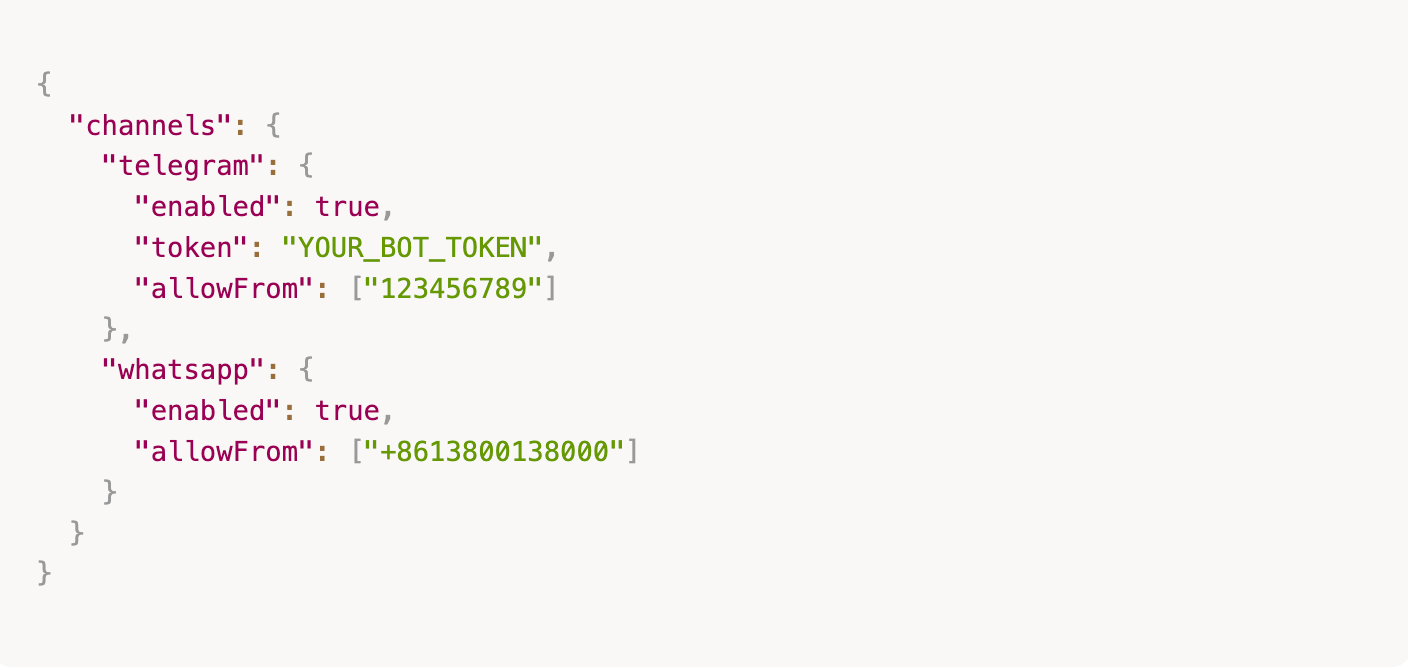 ⚠️ 新版本中,空 `allowFrom` 表示拒绝所有访问。如果想开放,必须明确写 `["*"]` 但不建议这样做。