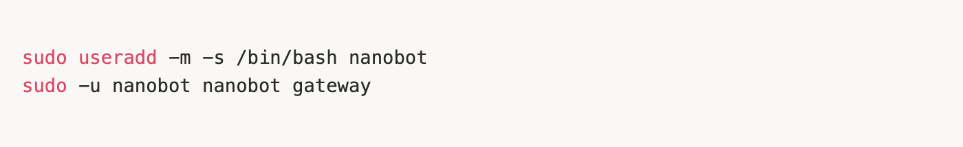 - 推荐将 nanobot 部署在 Docker 容器中,与日常使用环境隔离,避免因权限或环境混用导致安全风险。