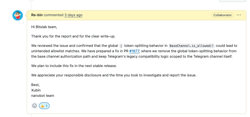 4. 第三方依赖:Nanobot 依赖的第三方库、API 服务和平台(如 、WhatsApp、LLM 提供商等)的安全性不在本指南的控制范围内。用户应关注相关依赖的安全公告并及时更新。