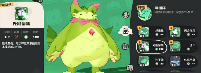 PVE场景下,魔力喵的核心技能组合为:光能聚集、纤维化、鼓劲、光合作用。其中,光能聚集为100威力的特殊攻击技能,每次使用后,后续草系技能威力提升60点;纤维化可提供70%的伤害减免效果,并在成功减伤后提升50%物防;鼓劲则直接增强150%特殊防御;光合作用用于叠加光合印记,为持续作战提供资源支撑。整套配置显著强化生存能力,同时保障稳定输出节奏,适用于中长期战斗环境。