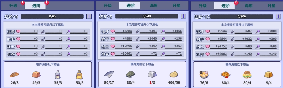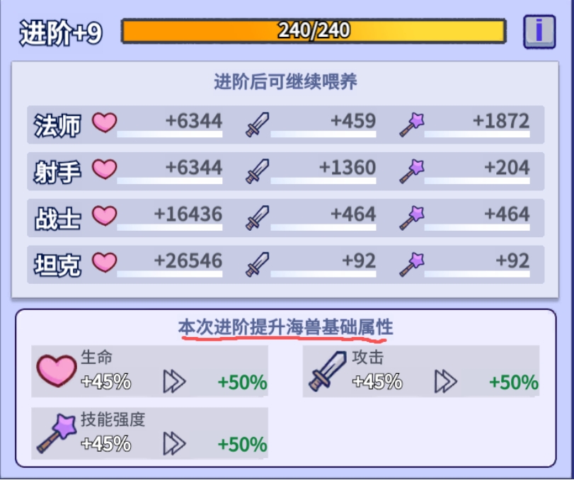 进阶这个模组实际上用处不大,因为给的属性太少了,升到12阶加的属性也就几万血、几千攻击,还不如升1级英雄加的属性多,并且每次进阶时加的百分比其实是给升级页面的海兽基础属性加的,而不是给英雄加百分比,所以实际加的属性很少,只能说聊胜于无了,有多的材料可以升,没必要特意升。