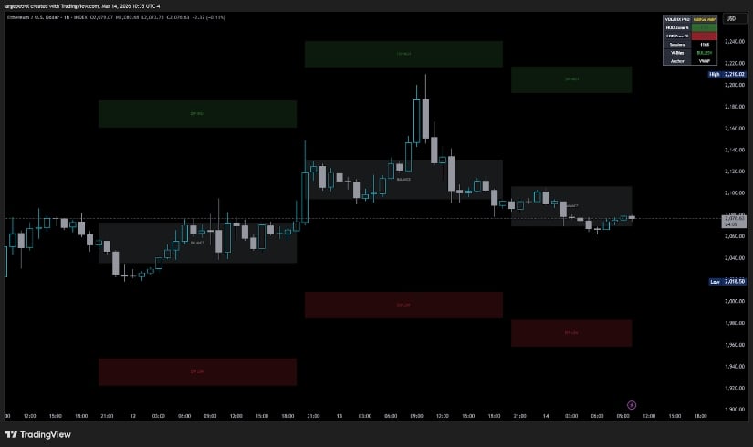 "使用Volatix范围地图指标观察以太坊1小时图,可见价格清扫EXP HIGH流动性区域后遭拒止,"分析师写道,"市场结构呈现更低高点,下行磁吸效应指向EXP LOW区域。"