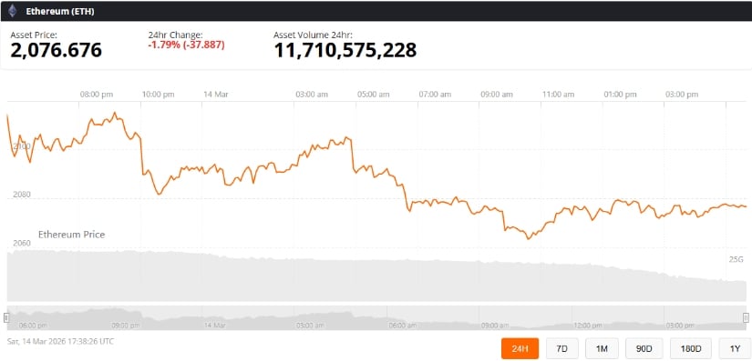 截至发稿时,以太坊(ETH)交易价格约2,076美元,24小时下跌1.79%。来源:Brave New Coin