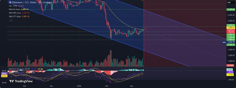 振荡器信号分布显示当前2卖8平1买,表明ETH价格处于盘整阶段而非趋势性行情。移动平均线则呈现复杂信号:10日与20日EMA仍发出买入信号,在2,040-2,036美元构成支撑;但50日、100日及200日均线高悬于现价上方,暗示长期趋势尚未转牛。