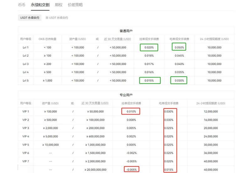 欧易平台将用户划分为普通用户与专业用户两类,手续费率根据OKB持仓量或交易量实行阶梯式划分。挂单与吃单采取差异化费率标准,普通用户挂单费率为0.015%-0.02%,吃单费率为0.03%-0.05%;VIP用户享受更优惠的挂单费率-0.005%-0.01%。