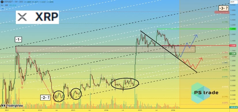 XRP处于修正阶段,下行可能探至0.9美元,上行或达3-6.66美元区间。来源:P_S_trade on TradingView