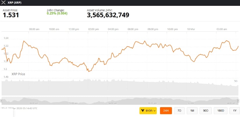 截至发稿,XRP报1.53美元,24小时涨幅0.25%。来源:Brave New Coin XRP价格