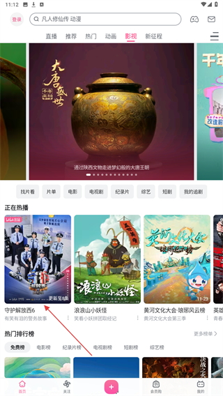 1、首先启动哔哩哔哩APP,在首页上方找到并点击“影视”标签。