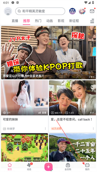 1、打开哔哩哔哩应用,在首页下方点击“我的”图标。