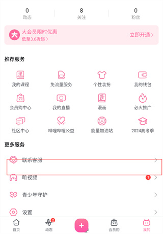 2、进入“我的”页面后,找到并点击【联系客服】功能。
