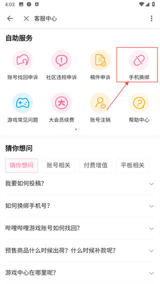 3、在客服中心界面中,点击右上角的【手机换绑】选项。