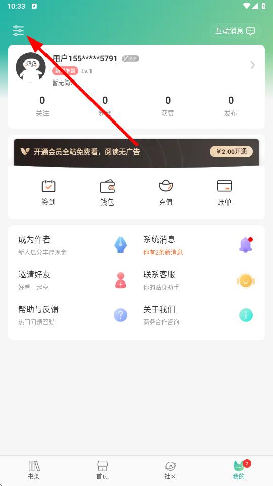 2. 在个人页面左上角找到“设置”图标并点击。