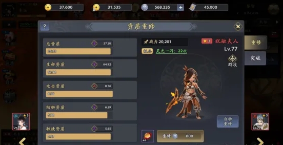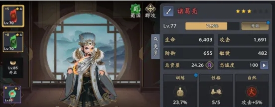 3、65级主线完成后,解锁的性格机制也可以让武将全方位提升,另外训练提升技能和属性;使用“重修丹”有机会触发“灵光一闪”,突破资质上限!