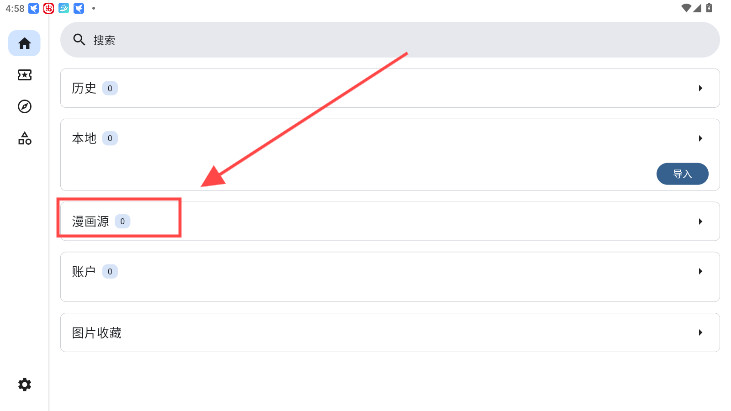 1、打开 Venera 应用后,在首页找到并点击“漫画源”选项;