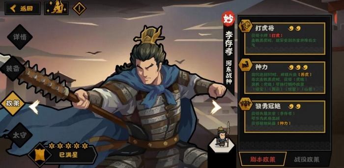 这里噬金的效果是战斗力加12,惊穹是大范围内敌军受到伤害并降低士气,山君是获得30点虎魄,裂云泽是战胜攻占进度加10点。这么综合看下来李存孝的强度非常高,虽然会为敌人召唤黑虎,但击败黑虎带来的收益很高,可以大幅加快获胜进度。