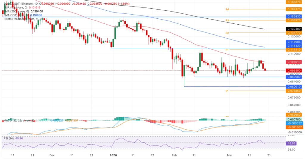 交易者正关注2月11日低点0.0879美元作为下一关键支撑位。若跌破该区域,可能进一步下探2月初形成的0.0800美元深度支撑。反之,若能持续站稳0.1016美元上方,则有望上攻0.1144美元阻力位。