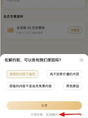 最后在确认弹窗中选择"不想反馈,直接解约"即可成功取消自动续费。
