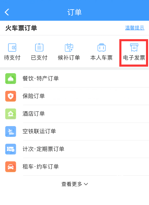 铁路12306中订单超过30天就无法再看到了,想要找到并查看到30天之前的订单信息,可以在我的页面中点击我的订单, 然后选择电子发票选项,点击开具电子发票,然后就可以看到之前乘坐过的车票信息了。