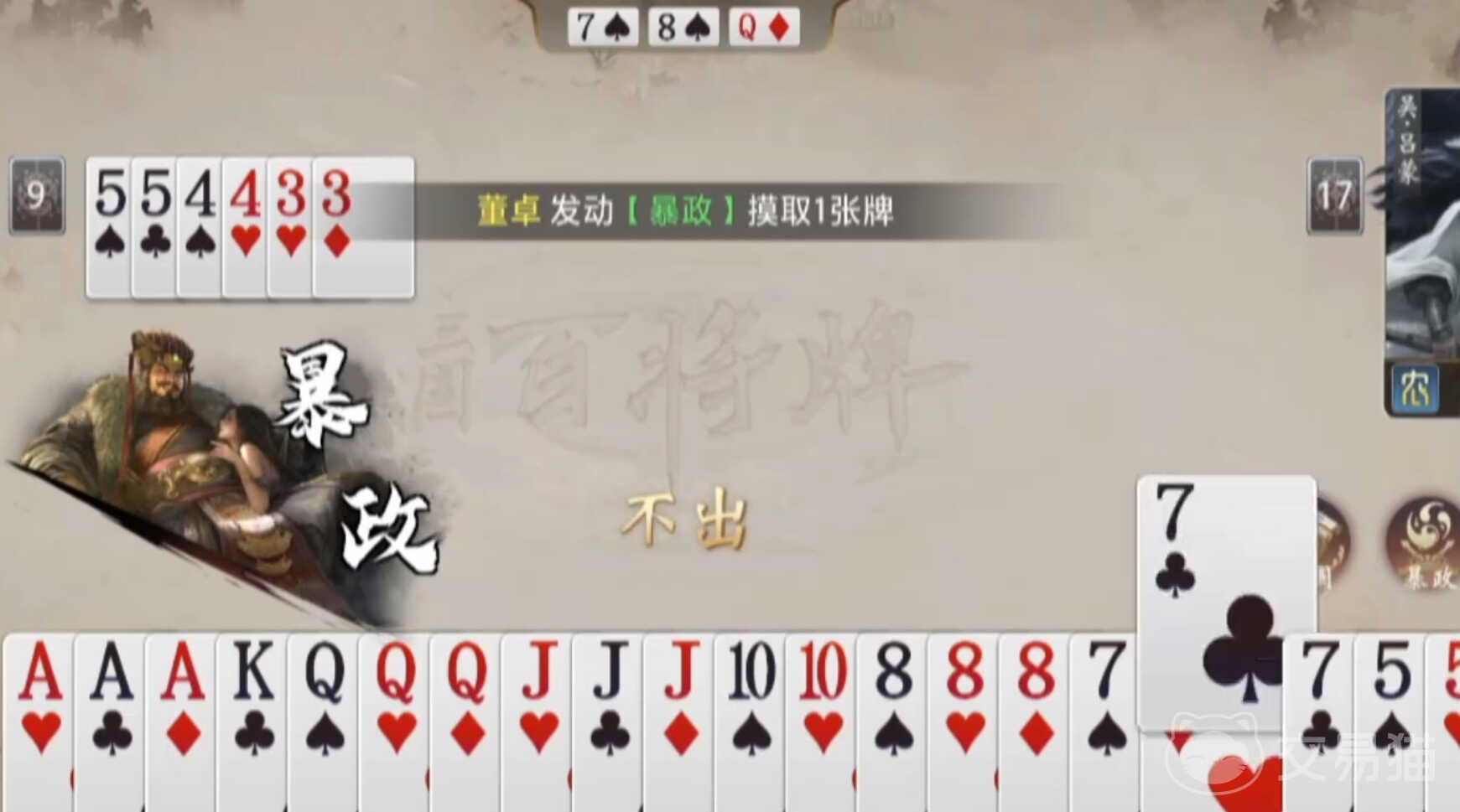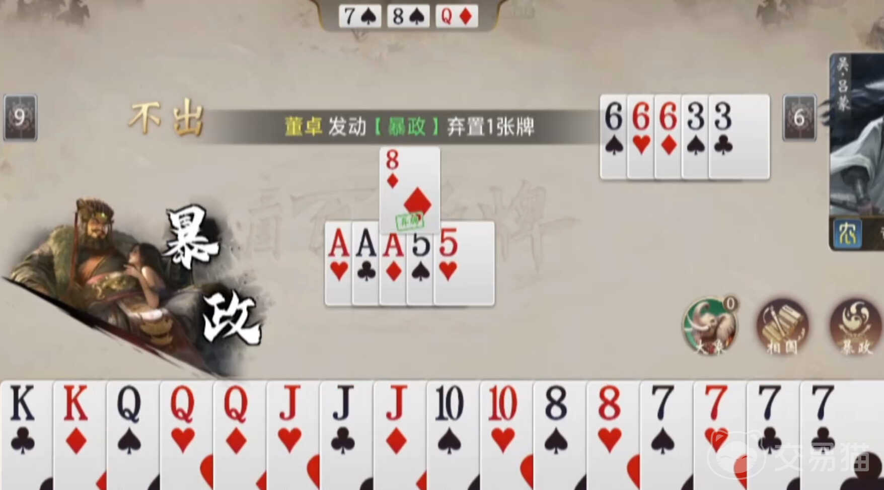董卓拥有两项固定被动技能:【相国】与【暴政】。其中【相国】仅在三人局生效,使玩家在叫地主阶段自动获得首轮叫分资格;而【暴政】则提供双向操作路径——当选择压牌时,可主动弃置一张手牌;若选择不压牌,则触发随机摸牌效果。这一设计赋予董卓极强的策略弹性:既可通过主动弃牌压缩手牌结构、加速出牌节奏,也可借由持续摸牌积累关键组合,为后续炸弹、顺子、三带一等高阶牌型做准备。当前主流打法以囤牌流为主,尤其适用于手牌分散、单张较多或缺乏连贯性的情况。