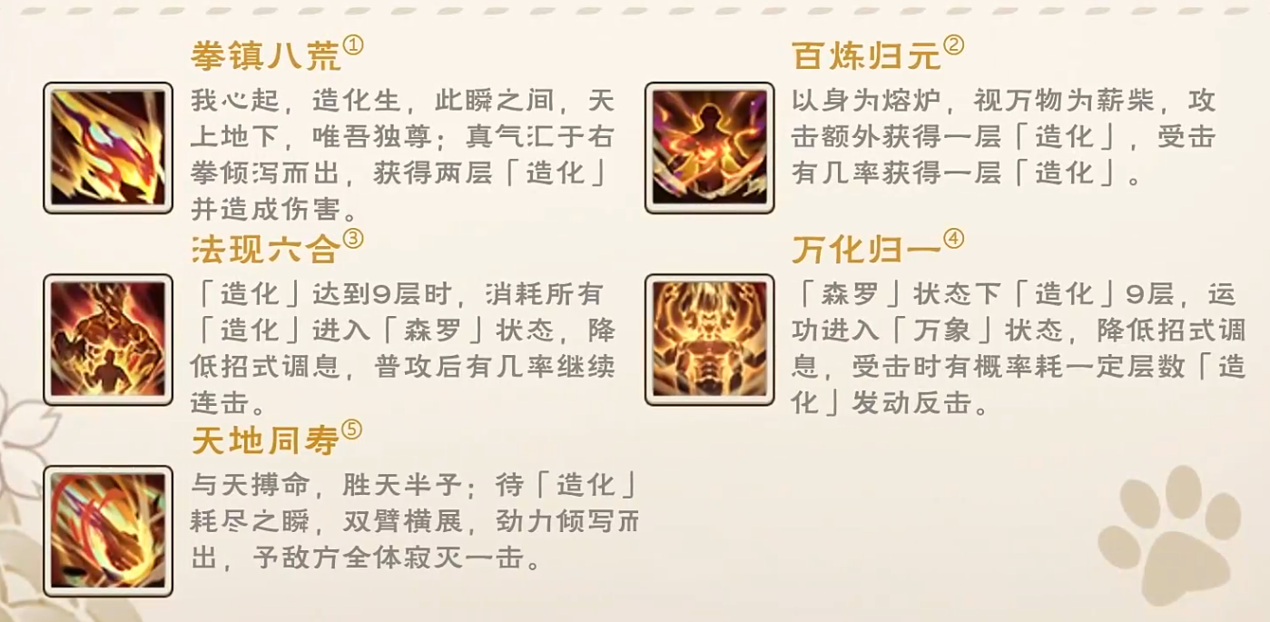首式【拳镇八荒】为单体爆发技,命中目标后稳定获得两层“造化”状态,是构建连招循环的基础起点。次式【百炼归元】具备双向触发逻辑:主动攻击时额外获取一层造化;受击时亦有概率获得一层造化,显著提升资源积累效率,适合高频对抗场景。
