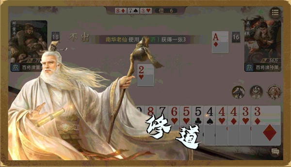 解析:当南华老仙打出包含【2】的牌型时,将发动【修道】技能,可以获得1张【3】;