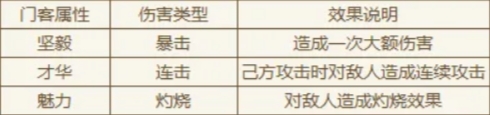 门客主要分为三种属性:坚毅、才华和魅力,不同属性对应不同伤害类型