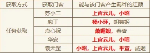 门客和红颜能产生羁绊效果,下面列举的是主线任务获取门客与其羁绊红颜。(标红红颜为主线获取红颜)