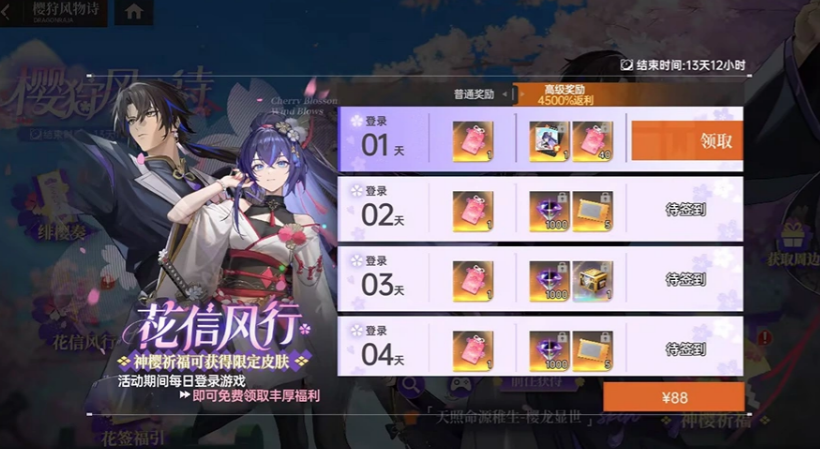 活动首环为「花信风行」每日签到系统。玩家连续登录即可领取「神樱御守」,总计可免费获取7枚。该道具为后续核心玩法的关键消耗品,务必每日进入活动页面完成领取。同步开放的「神樱花签·橙」刮刮卡具备即开即得特性,单次抽取即有机会直接获得高价值奖励。当签到进度达成并解锁全部阶段后,将解锁限定角色皮肤「隐狩矢吹樱·风起樱舞时」,其设计融合日式浮世绘风格与动态樱花元素,视觉表现力突出。