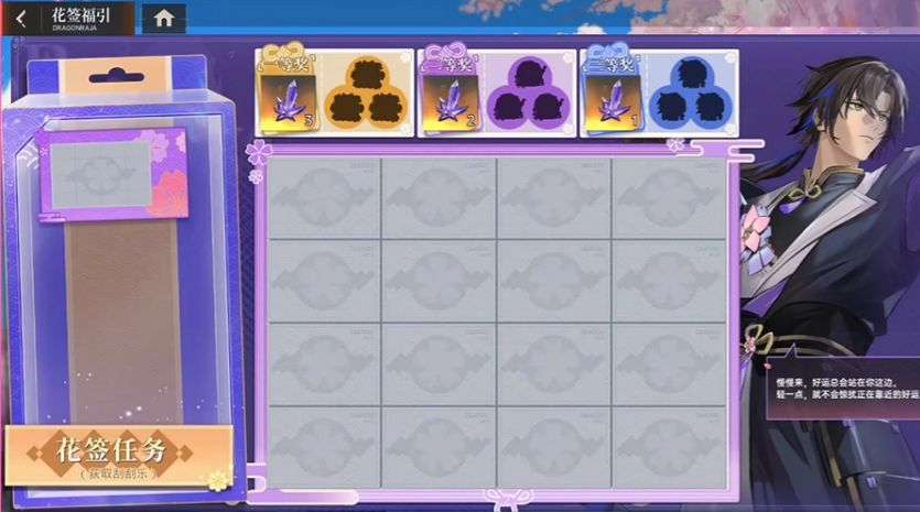 「花签福引」模块以任务驱动为核心机制。玩家通过完成日常活跃任务积累进度,每完成一轮任务可领取「随机刮刮乐礼包」,内含不同稀有度的「神樱花签」刮刮卡。刮卡规则采用三连匹配制——刮出任意相同图案三枚即可兑换对应档位奖励。此外,达成全部活动成就后还可额外领取「神樱御守」,进一步补充祈福所需资源储备。