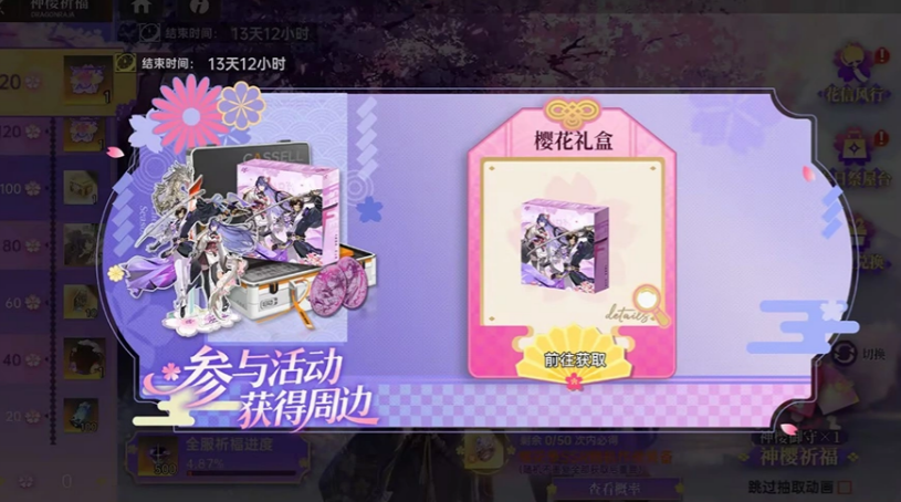 「神樱祈福」为本次活动的核心产出路径。玩家需消耗前期积攒的「神樱御守」进行祈福操作,随着祈福次数累计,逐步解锁多重奖励。其中包括限定头像框「游樱百景」、高人气角色皮肤「天照命源稚生·樱龙显世」、全新作战装备套装「樱吹雪」,以及实体周边「樱花礼盒」。值得注意的是,「樱吹雪」套装并非仅在满额祈福后发放,每次祈福均存在独立概率掉落,提升过程参与感与即时反馈体验。