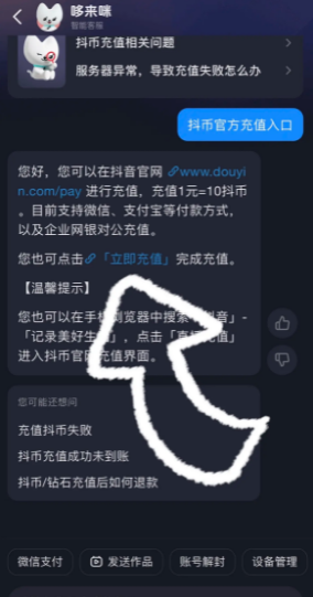 5. 在聊天窗口输入"抖音官方充值入口",按指引完成充值操作