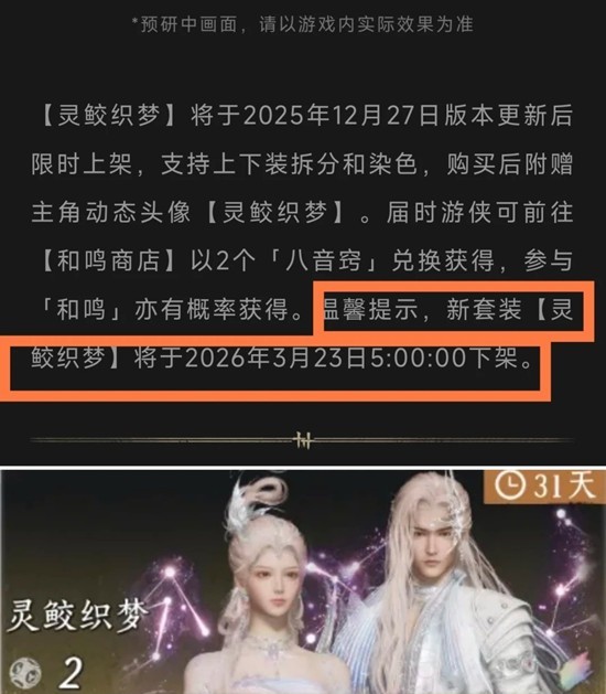 【灵鲛织梦】下架时间不变,依旧是3月23日;