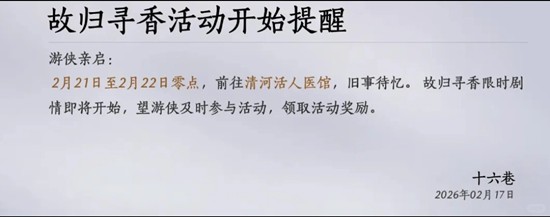 2. 限时活动【香寻归故】开启,恰逢寒姨生日,可解锁其第四段传记,逾期无法补领。