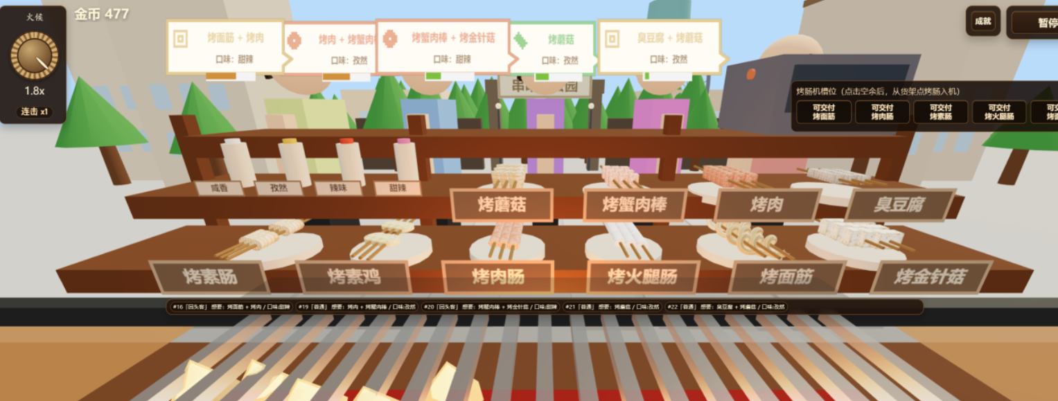 游戏中,玩家需应对不同口味偏好的顾客需求,灵活运用数十种基础食材与特色调料,通过实时火候控制与翻烤节奏调整,完成风味各异的烤串组合。采用清新明快的卡通美术风格,界面简洁友好,操作响应迅速,新手也能在几分钟内掌握核心流程。从空无一物的铁架开始,逐步升级设备、拓展菜单、装修摊位,最终打造出人气爆棚的个性烧烤档口。