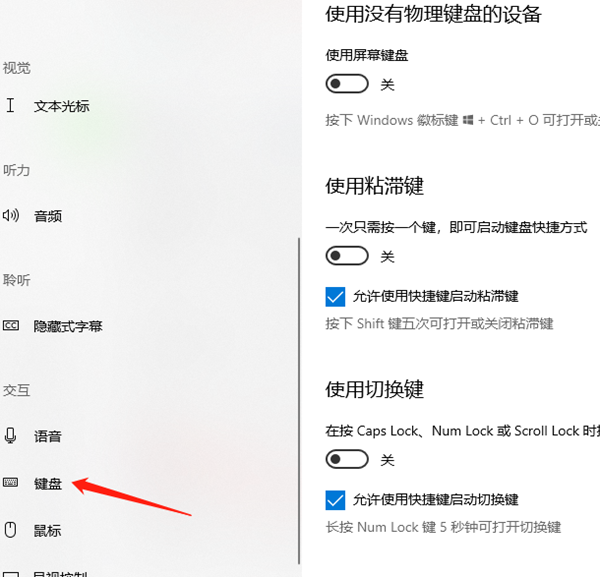2、浏览菜单直至底部,在【键盘】栏目内,请将有关【使用粘滞键】与【使用切换键】部分均予以关闭。