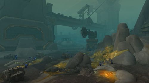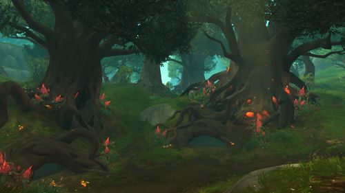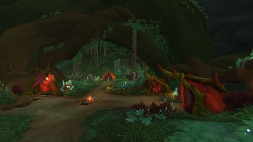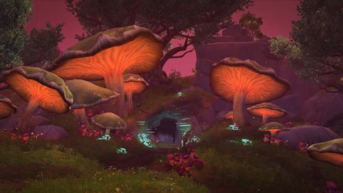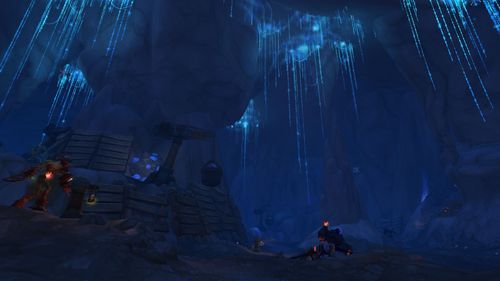 在圣落之地中,玩家会看到超大型的水晶、有着非常明亮的光芒,这这两地点之间切换,我们很希望让玩家有视觉震撼效果,就是那种没有预期到、很难想像的情况。在圣落之地我们会遇到圣光追随者,这里的设计也结合了故事,可以让人思索他们为何会来到这里?在这个地方光源来自于上方水晶,这光源有明暗不同时期,当暗下来时周围环境会改变、光缐一变暗、可能不同敌人会来攻击,因为没有犟大光源、怪物胆子就变大了,而这里所有植物都会面对水晶、因为那是唯一光源;我们打造地底世界的自然规则。值得一提的是,在这里我们不是用室内技术来打造场景,而是用室外空间的技术来打造这个地底庞大空间,在《魔兽世界》创造不同的自然法则,这里的明暗转换是因为魔法,而不是大自然自然力的关系。