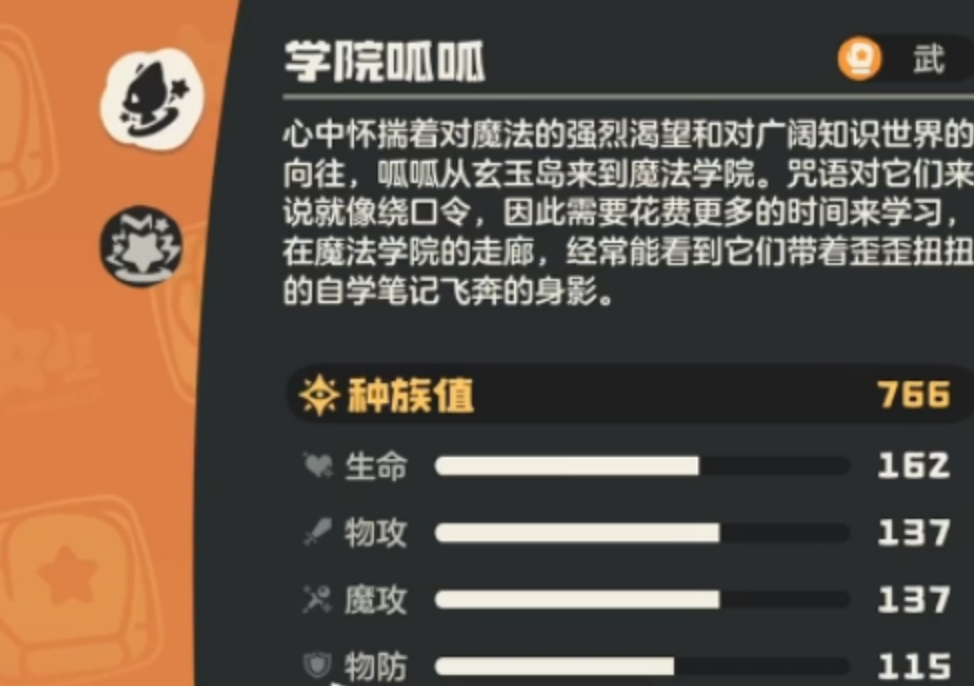 学院呱呱属于典型的多面手型精灵,基础属性分布呈现显著的三维均衡特征:生命值、物理攻击、魔法攻击三项数值在当前版本中均位列梯队前列;物理防御与魔法防御则维持在中等偏上水平,可有效应对常规强度的混合伤害。其核心被动“留学生”具有明确的策略导向——每次主动施放技能均额外消耗2点能量。这一设定虽提升了操作门槛,却也强化了战斗节奏的可控性与决策深度。尤为突出的是,该精灵拥有全系攻击类技能学习权限,技能池覆盖范围极广,为个性化配招提供了坚实基础。能否在关键回合保留足够能量,直接决定其持续作战能力的上限。